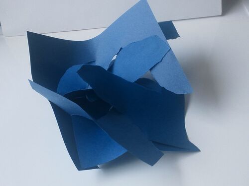 ●双子のコンストラクション(同じ大きさの二枚の正方形の紙に、まったく同じ切り込みをいれて、その二枚を組み合わせてつくる立体)。